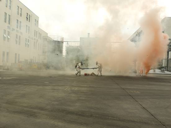 本次演練模擬黃磷在使用過程中,存在管道故障等異常時發生黃磷泄漏。事故發生后生產部立即向公司領導及相關部門進行報告,公司領導、安環部、工程與技術管理中心、辦公室等相關部門接到事故報告后,第一時間趕到現場,公司立即啟動應急處置預案,成立事故現場指揮部,進行應急救援處置工作。
